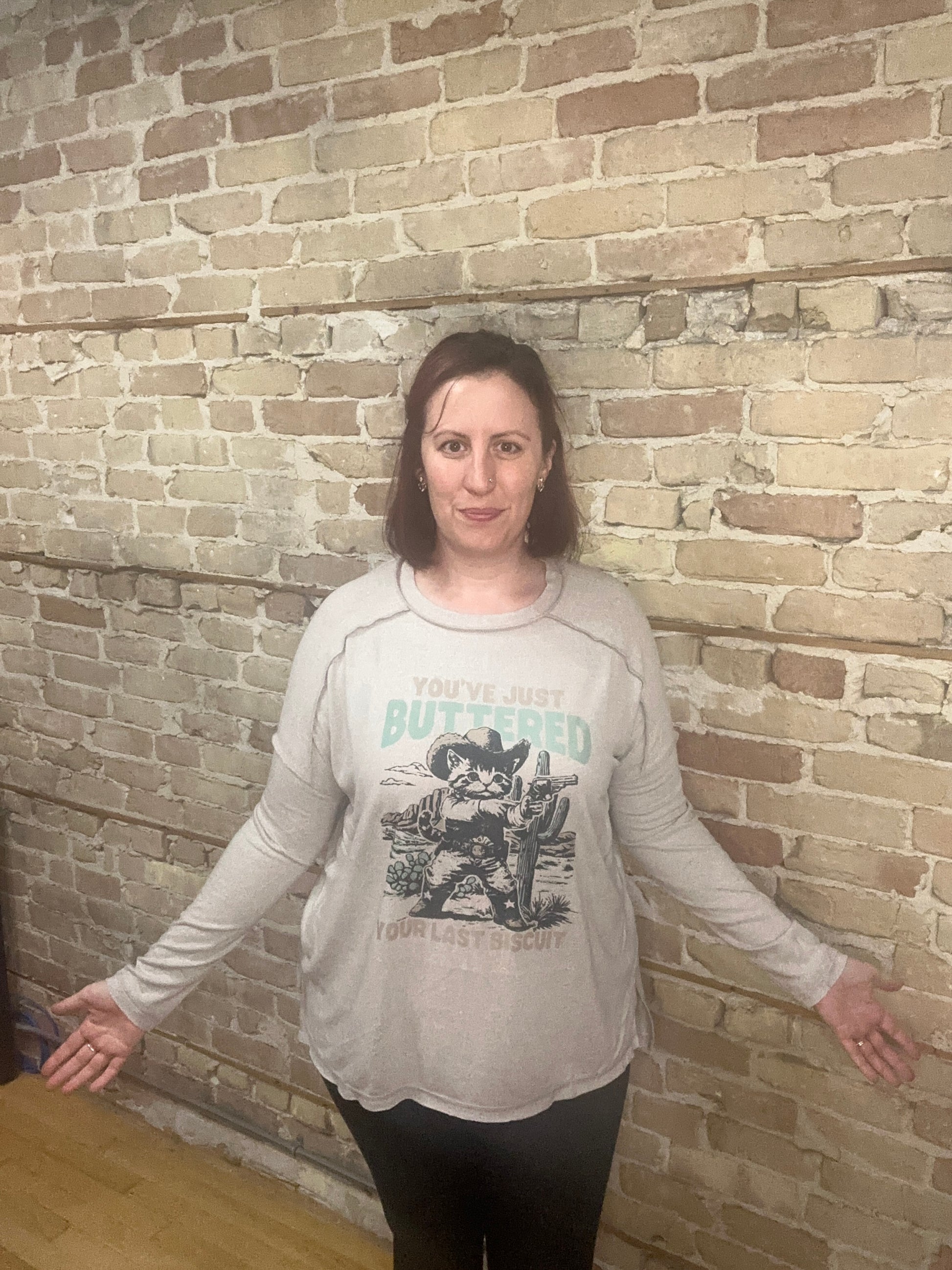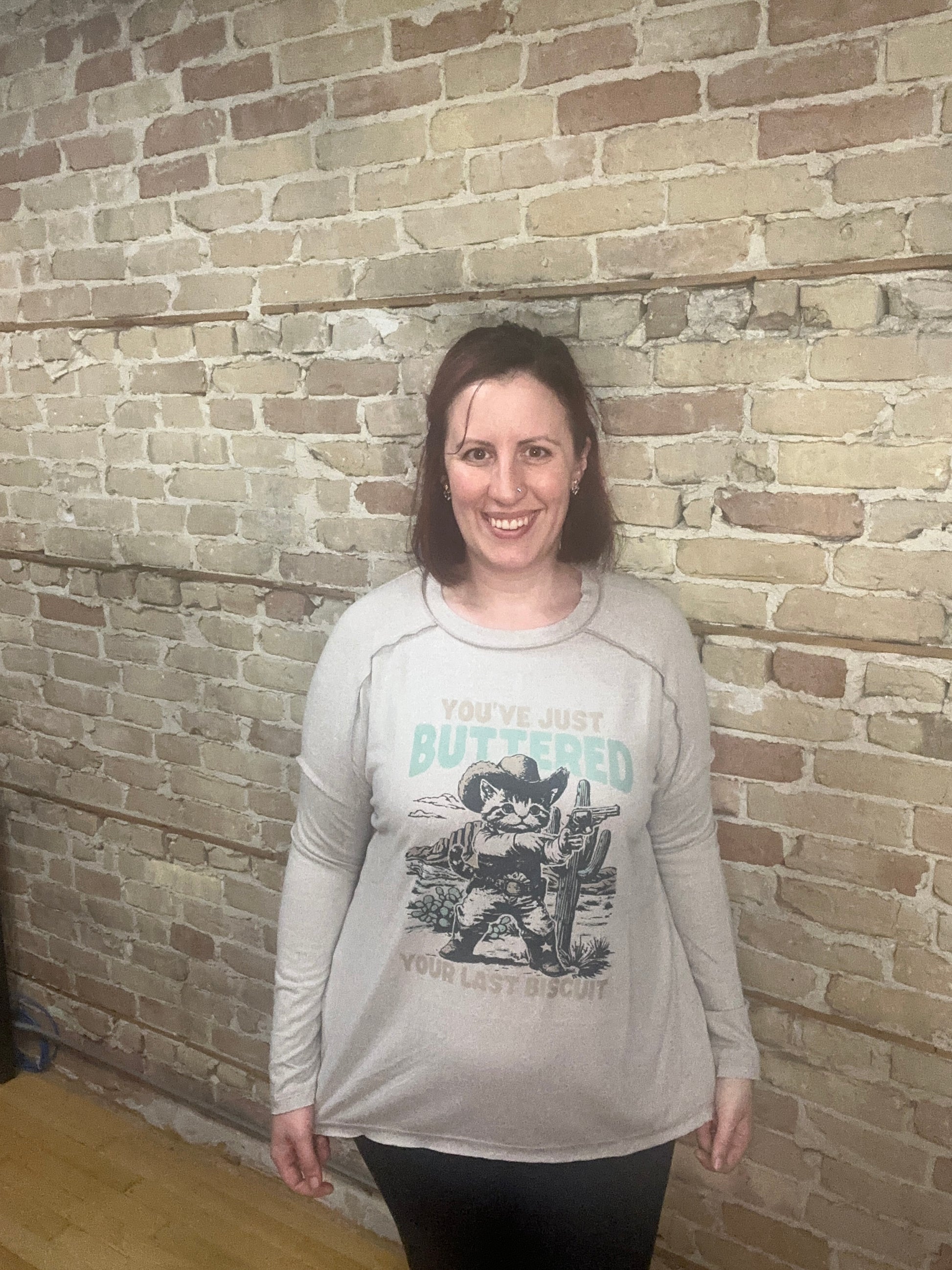 This playful long sleeve shirt blends comfort and charm with its soft polyester/spandex fabric. Featuring a mischievous Wild West kitten and the cheeky phrase "You've buttered your last biscuit," it's perfect for adding a touch of fun to your casual wardrobe. The ash mocha color pairs effortlessly with any outfit while the stretchy blend ensures all-day comfort. Ideal for those who like a little sass with their style.