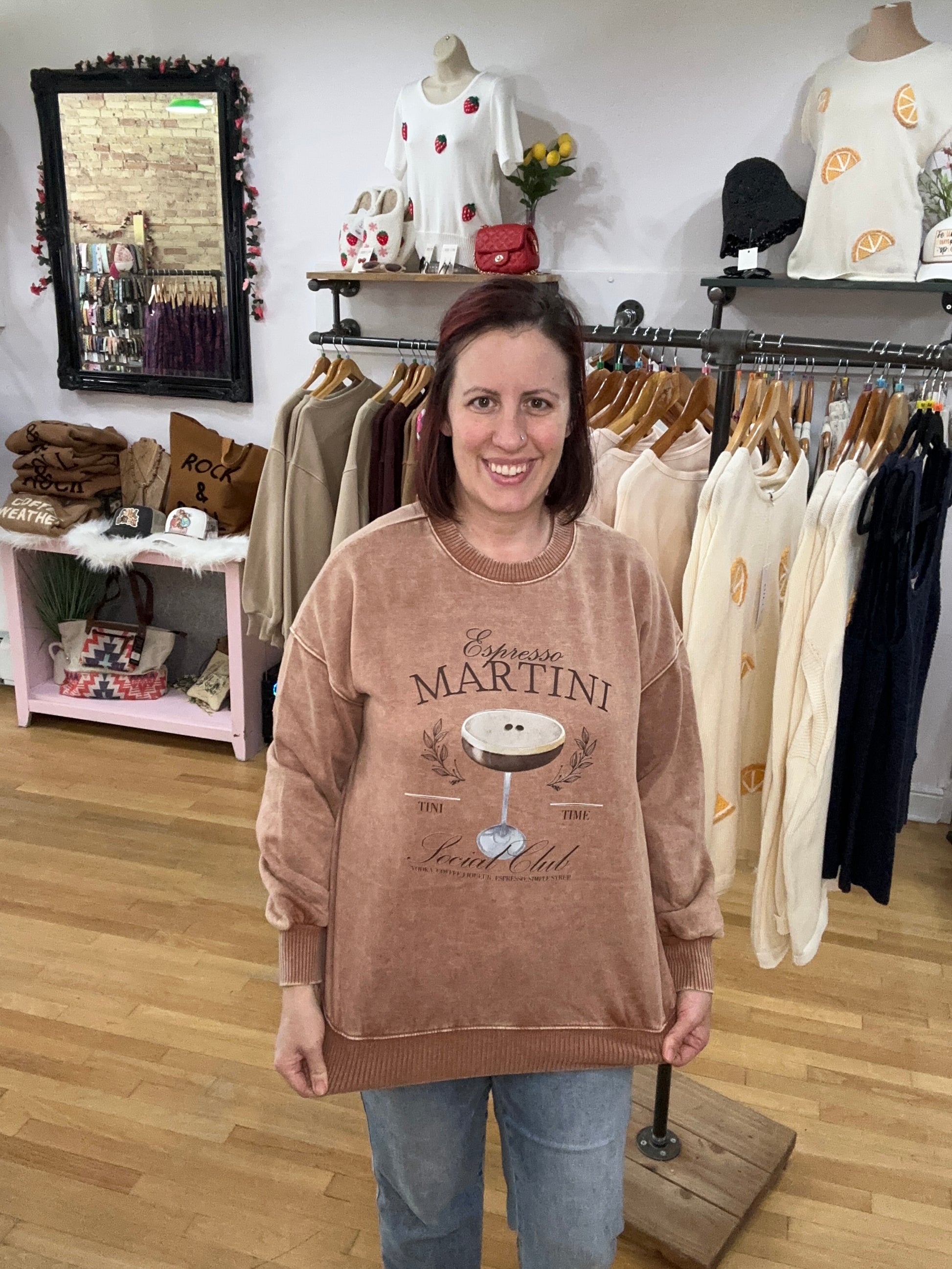 Get cozy in this Rust Brown Acid Wash Sweatshirt featuring a fun Espresso Martini graphic and "Espresso Martini Social Club" lettering. Perfect for those who love a stylish twist and a little coffee-fueled flair, it’s your new go-to for casual hangouts or relaxed evenings with friends. Embrace comfort with a splash of playful charm.