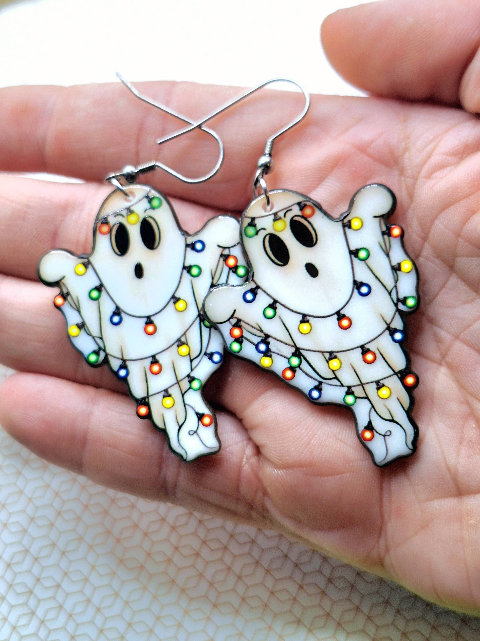 Each ghost is covered in a array of christmas lights. These earrings are the perfect addition to a earring collection for both Halloween and Christmas.