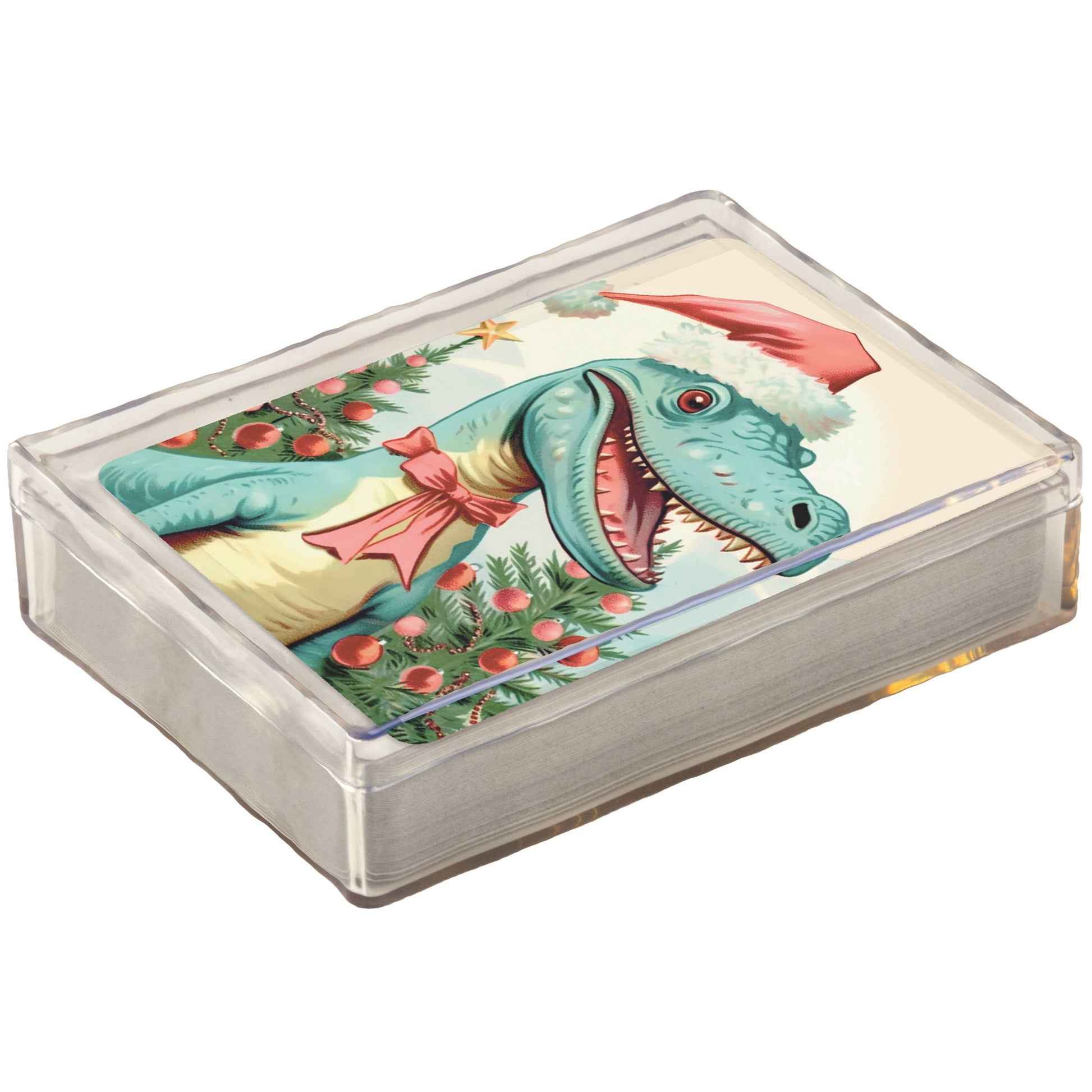 A 54-card playing deck from our Christmas Collection displaying fun retro art of dinosaurs celebrating Christmas on each card in a pastel color palette. Our Dino Christmas playing cards are packaged in a protective acrylic case for easy storage when not in use or traveling. A fun dino-themed Christmas gift perfect for on the go games.