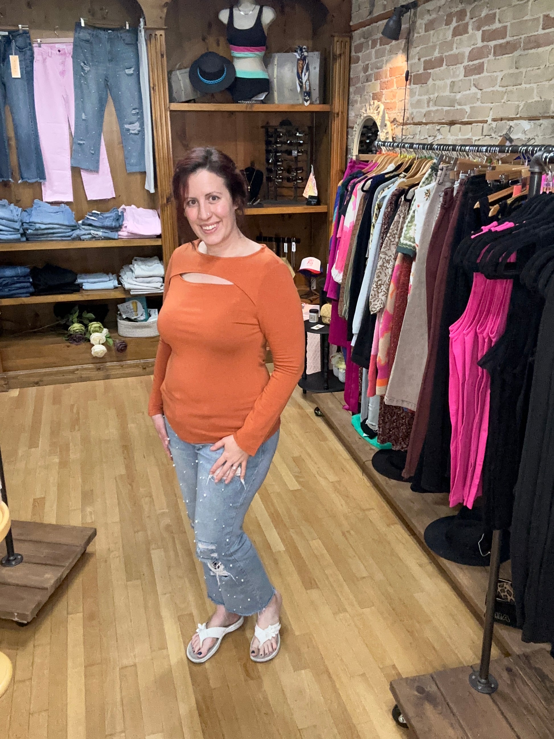 Add a pop of playful charm to your everyday wardrobe with this Rust Cut Out Top. Crafted from cozy French terry, it features fun cut-out details that keep it casual yet eye-catching. Perfect for layering or wearing solo, this long sleeve basic brings a fresh twist to your laid-back style.