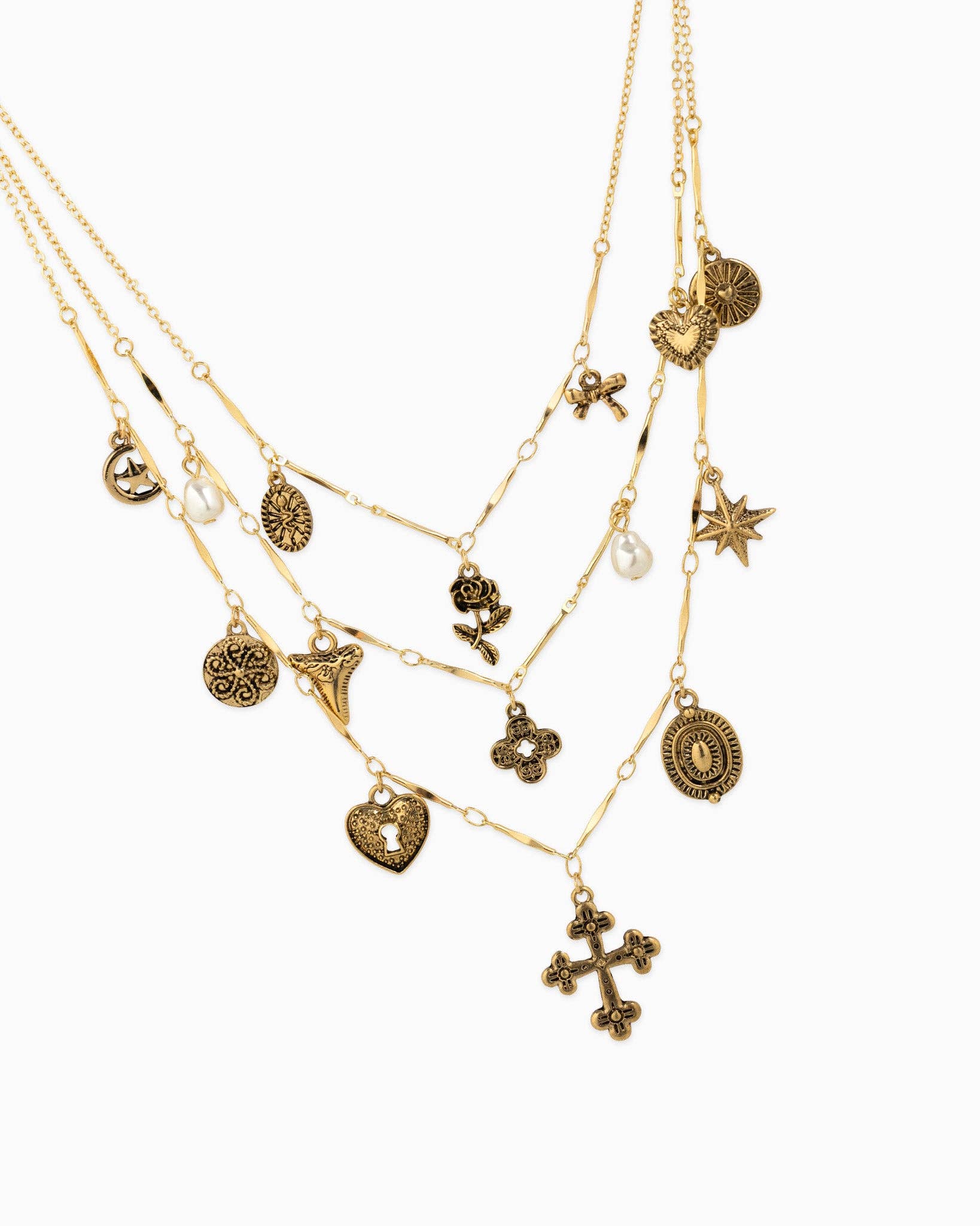 Discover a playful trio of vintage-inspired charms—crosses, lockets, stars, pearls, and delicate florals—all layered to add a dash of charm and whimsy. Crafted from steel, zinc, and acrylic pearls, this necklace set comes in lengths of 14, 16, and 18 inches for a perfect layered look.